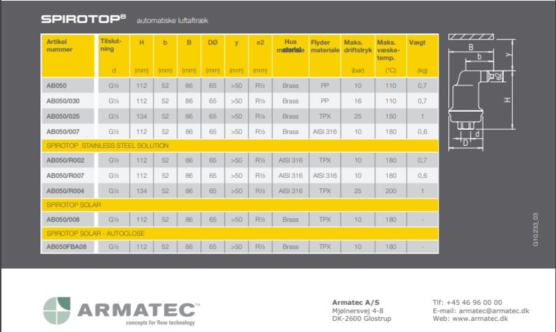 Automatisk luftudlader til effektiv udluftning i varme og køleanlæg. Maks. 50% glykol. Fås med flyder materiale af PP, TPX og AISI afhængigt af medie og temperatur.