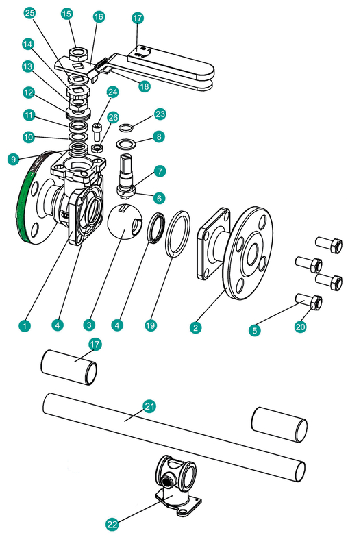 | 22 | Støtte for rørhåndtag | Rustfrit stål GX5CrNi19-10, A351 CF8 (1.4308) | ||||||||||||||||||||||||||||||||||||||||||||||||||||||||||||||||||||||||