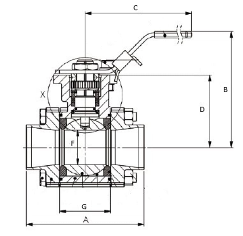 Tre-delt kuleventil med redusert lÞp i syrefast stÄl/CPTFE med innvendige gjenger og toppflens for aktuering. Tre-delt for enkel service og vedlikehold. Hovedsakelig for syrer og saltlÞsninger, gass, damp, varmt og kaldt vann.
