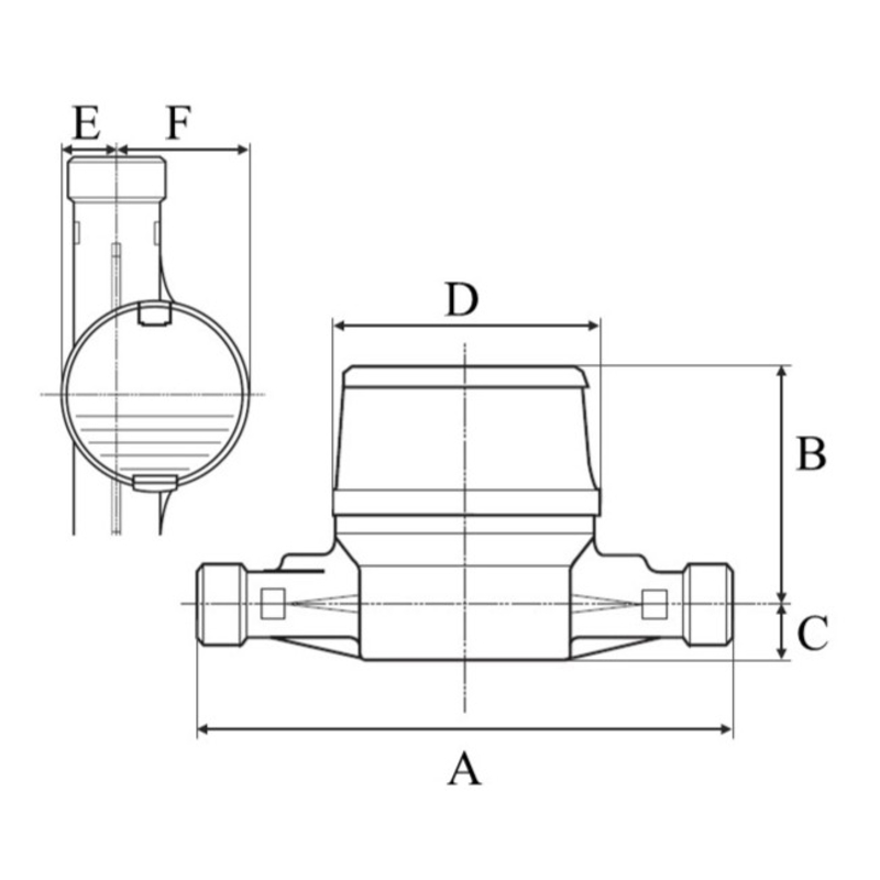 Torrlöpande, enstrÄlig vinghjulsmÀtare för mÀtning av kallvatten med noggrannhet R160. GÀngad anslutning, horisontellt montage. Förberedd för puls/datagivare (M-Bus)/wMBus typ AT 7275CY.