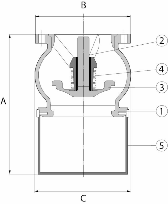 Flänsad bottenventil som förhindrar återströmning av vatten på sugsidan i pumpledningar. Backventil inklusive utvändig silkorg för tex kylsystem, bevattningsanläggningar och för vattendistribution.