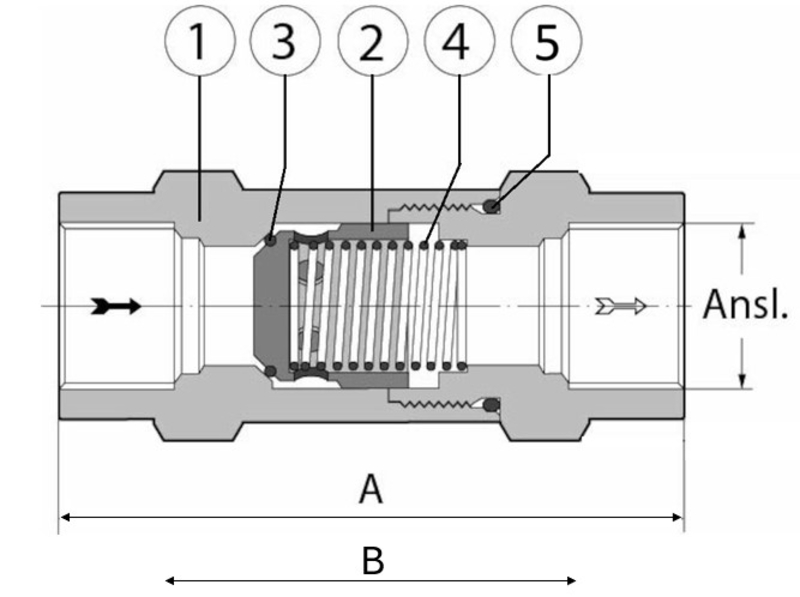 Ventilen har fjäderbelastad kägla, vilket medför att den kan monteras i valfritt inbyggnadsläge, samt att den stänger innan mediaströmmen vänder.