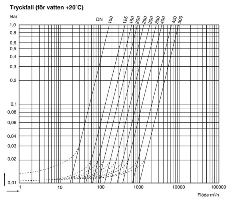 I tryckfallsdiagrammet nedan: PÄ den krökta delen av linjen Àr ventilen inte helt öppen och kan vara instabil (mindre dimension bör vÀljas). PÄ den raka delen Àr ventilen fullt öppen och skall öppna stabilt.