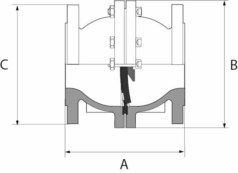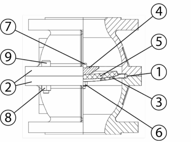 Det flexibla membranet (tjock elastomerskiva), vilket Àr fastmonterat i ventilens centrum, tÀtar mot gallersÀtet. Den fria genomströmningsarean Àr lika stor som anslutande rörledning. GallersÀtet Àr, sett frÄn utloppssidan, konkavt format, varför ventilen Àr helt tÀt vid nollflöde oavsett inbyggnadslÀge.