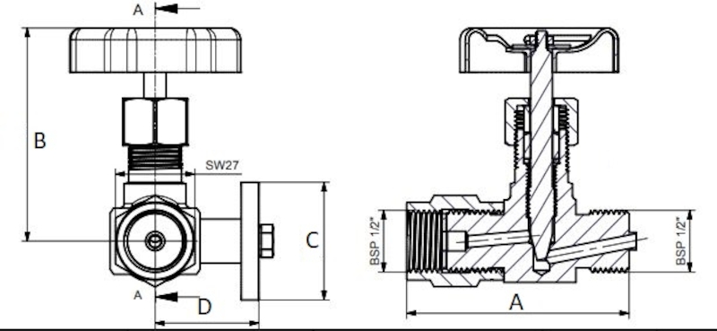 Kontrollmanometerventil med invändig/utvändig gänga i mässing. För avstängning och reglering av ånga, gaser och vätskor. Ventilerna har invändig spindelgängning med stigande spindel och ratt. Ventilen har höger- resp. vänstergänga. Boxpackning av aramid/NBR.