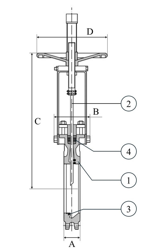 Avstängningsventil med handratt och stigande spindel. Fullt genomlopp, ger lågt tryckfall och minimerar risken för igensättning. Homogent gjutet ventilhus eliminerar läckage till atmosfären och förhindrar skevdragning av spjället. Tät packbox genom glandspårets utformning med PTFE-impregnerad fläta. Ingjutna styrklackar i huset ökar spjällbladets anpressning mot mjuktätningen vid stängning. Utbytbar mjuktätning och packbox-tätning.
